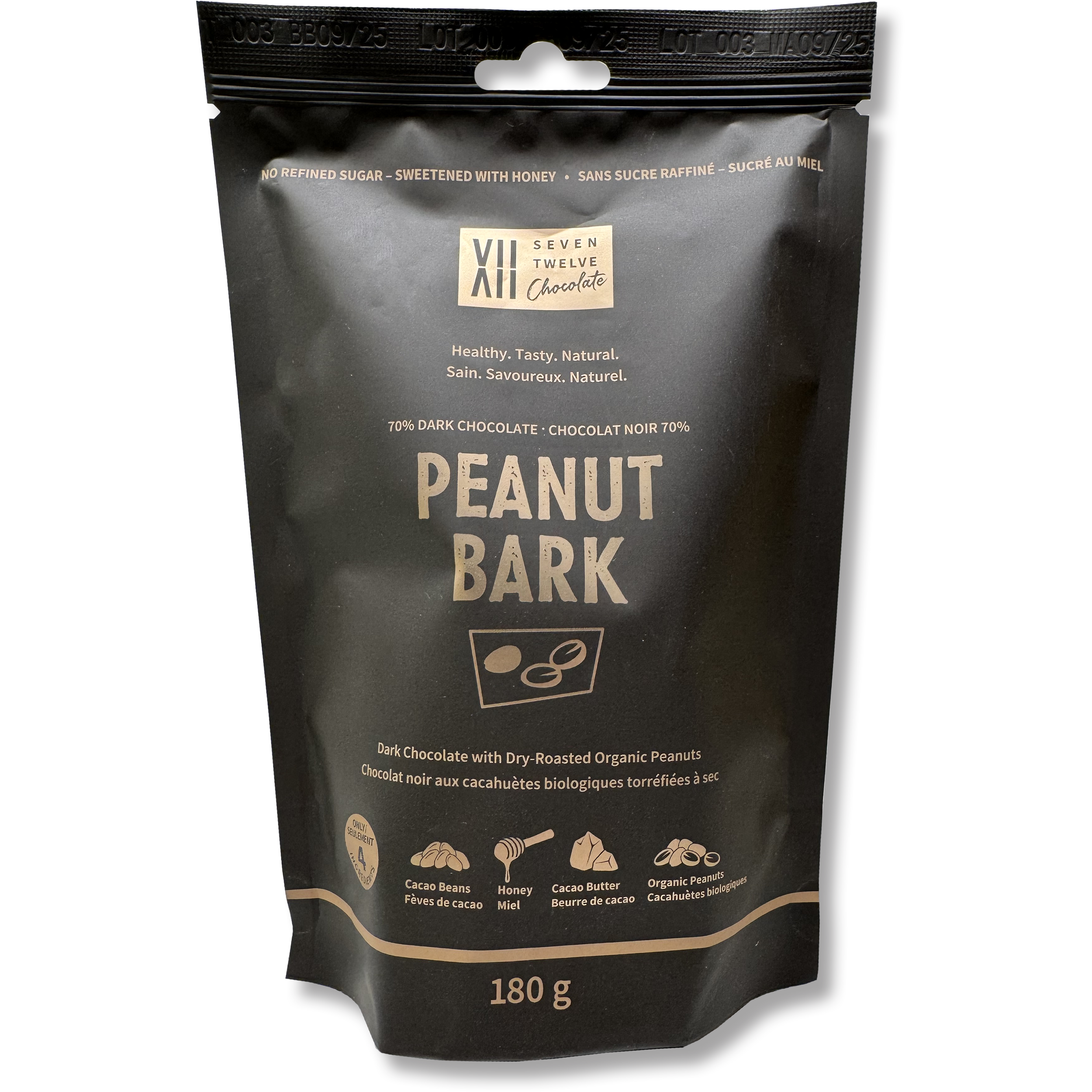 Crunchy, sweet, savory, and fudgy. The chocolate in this peanut bark is our same 3 natural ingredient chocolate. The peanuts are organic and dry-roasted.
